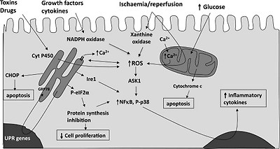 The resultant release of Ca2+ from the ER will activate diverse Ca2+-sensitive processes within the cell,14, 15 including many of the signalling pathways above. It also has a profound effect on function. The loss of chaperone activity results in the accumulation of misfolded proteins within the lumen, leading to further generation of ROS as attempts are made to refold them.4 The accumulation will also stimulate the unfolded protein response (UPR), a highly conserved set of signalling pathways that aim to restore homeostasis, but, if this fails, will stimulate apoptosis.16, 17 The relationship between oxidative and ER stress will be considered in greater detail later.