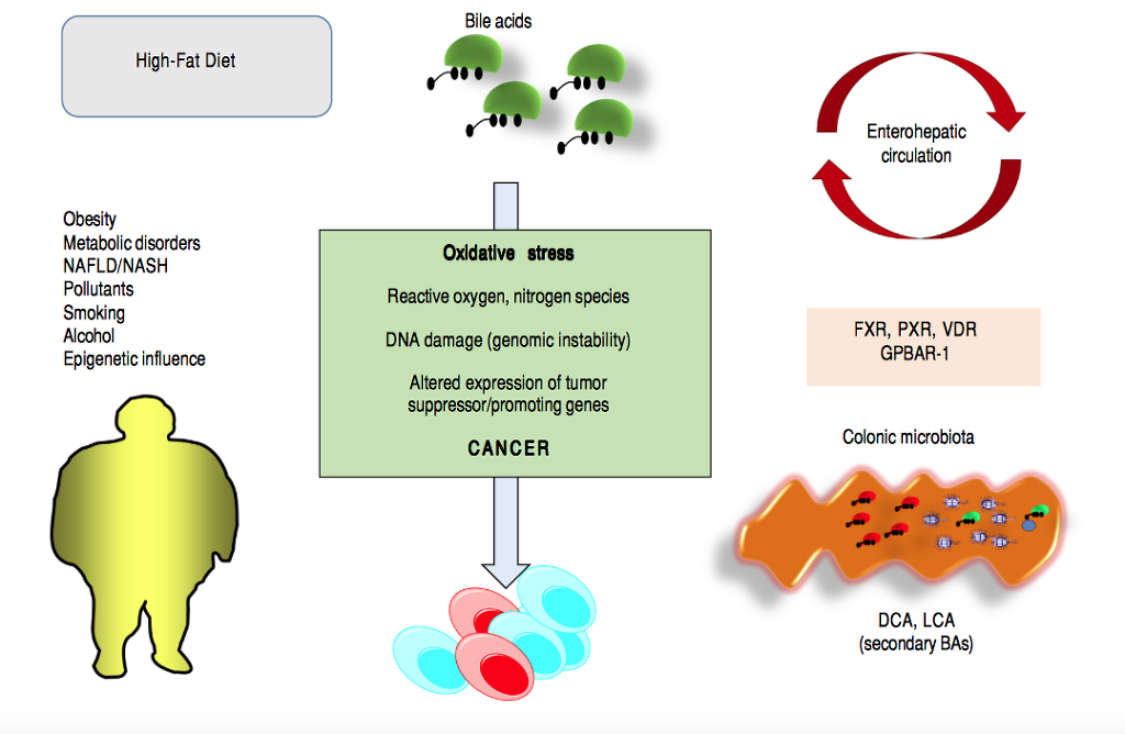 Bile acids (BAs) regulate the absorption of fat-soluble vitamins, cholesterol and lipids but have also a key role as signaling molecules and in the modulation of epithelial cell proliferation, gene expression and metabolism. These homeostatic pathways, when disrupted, are able to promote local inflammation, systemic metabolic disorders and, ultimately, cancer. The effect of hydrophobic BAs, in particular, can be linked with cancer in several digestive (mainly oesophagus, stomach, liver, pancreas, biliary tract, colon) and ex- tra-digestive organs (i.e. prostate, breast) through a complex series of mechanisms including direct oxidative stress with DNA dam- age, apoptosis, epigenetic factors regulating gene expression, reduced/increased expression of nuclear receptors (mainly farnesoid X receptor, FXR) and altered composition of gut microbiota, also acting as a common interface between environmental factors (includ- ing diet, lifestyle, exposure to toxics) and the molecular events promoting cancerogenesis. Primary prevention strategies (i.e. chang- es in dietary habits and lifestyle, reduced exposure to environmental toxics) mainly able to modulate gut microbiota and the epigenome, and the therapeutic use of hydrophilic BAs to counterbalance the negative effects of the more hydrophobic BAs might be, in the near future, part of useful tools for cancer prevention and management.