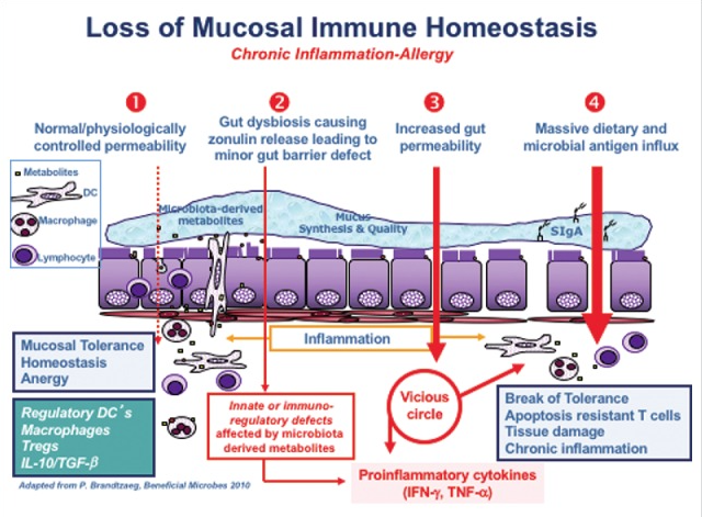 Proposed mechanism of zonulin in causing loss of barrier function leading to development of CID. Normal barrier trafficking of non-self antigens (antigen sampling), together with specific gut-associated lamina propria cells and cytokines micro milieu ...