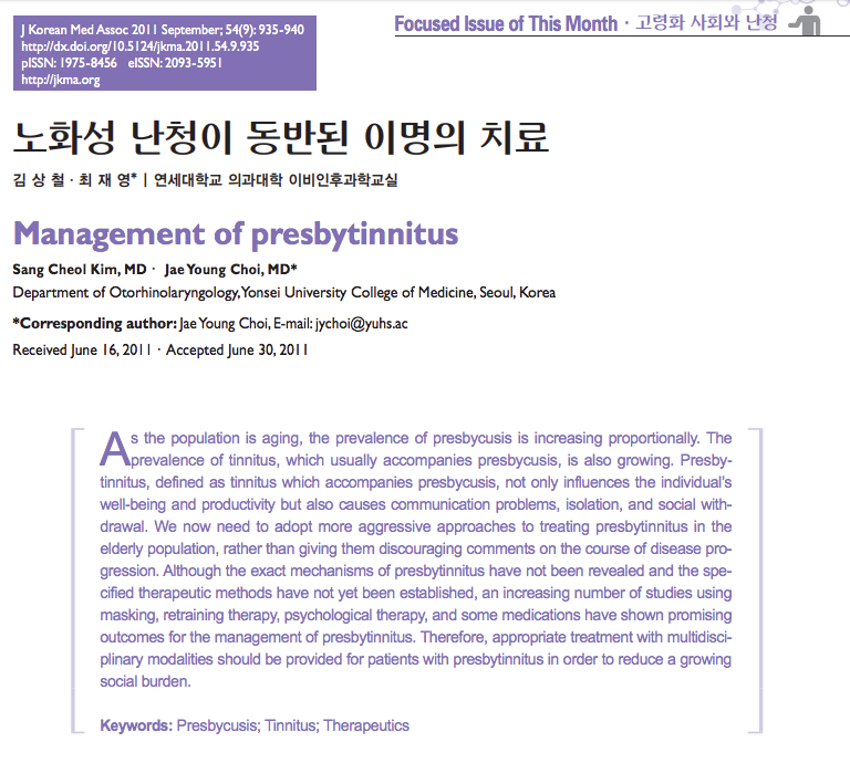 한 인구조사 보고서에 따르면 앞으로 10년 내에 65세 이상의 인구가 5세 이하 보다 많아질 것이고, 2040년까지는 고령화 인구가 13억 명에 달할 것이라고 한다[1]. 인구의 고령화에 따라 노화성 난청은 비례적으로 증가하며, 60-80세 인구의 40% 이상에서 25 dB 이상의 노화성 난청이 발생한다고 한다[2]. 난청에 흔히 동반되는 이명의 유병률도 나이에 따라 증가하여, 60세 이상에서는 12%에 달한다 [3].