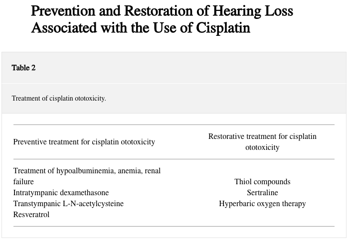 Several otoprotective molecules and strategies against cisplatin-induced ototoxicity have been tested in experimental animals. Some, like diethyldithiocarbamate, exerted important side effects in humans [16]. A summary of preventative and restorative treatment options is presented in Table 2.