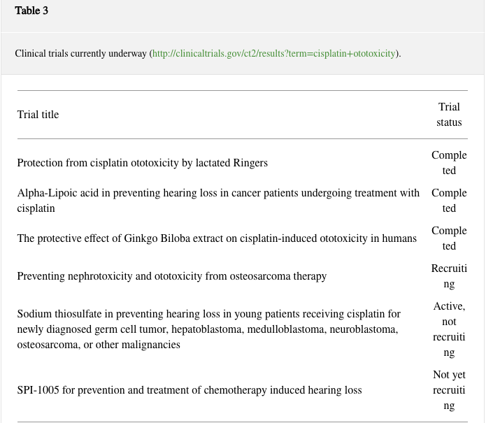Few clinical studies tested systemic otoprotective molecules for preventing cisplatin-induced hearing loss. Amifostine, a phosphorylated aminothiol designed to protect against radiation damage, was known to counteract the toxic effect of different anticancer treatments without interfering with the tumoricidal effect. Although significant protection of amifostine against haematological toxicity after high dose carboplatin therapy in a child with medulloblastoma was reported [39], a clinical study considering systemic administration of amifostine failed to prove any otoprotective effect against cisplatin-induced hearing loss in a group of pediatric patients treated with cisplatin associated with other chemotherapeutic agents [40]. Clinical trials currently underway as documented by their registration in a public database (http://clinicaltrials.gov/ct2/results?term=cisplatin+ototoxicity/) are listed in Table 3.