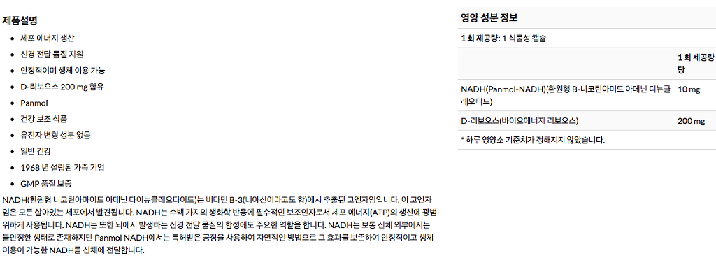 NADH(환원형 니코틴아마이드 아데닌 다이뉴클레오타이드)는 비타민 B-3(니아신이라고도 함)에서 추출된 코엔자임입니다. 이 코엔자임은 모든 살아있는 세포에서 발견됩니다. NADH는 수백 가지의 생화학 반응에 필수적인 보조인자로서 세포 에너지(ATP)의 생산에 광범위하게 사용됩니다. NADH는 또한 뇌에서 발생하는 신경 전달 물질의 합성에도 주요한 역할을 합니다. NADH는 보통 신체 외부에서는 불안정한 생태로 존재하지만 Panmol NADH에서는 특허받은 공정을 사용하여 자연적인 방법으로 그 효과를 보존하여 안정적이고 생체 이용이 가능한 NADH를 신체에 전달합니다