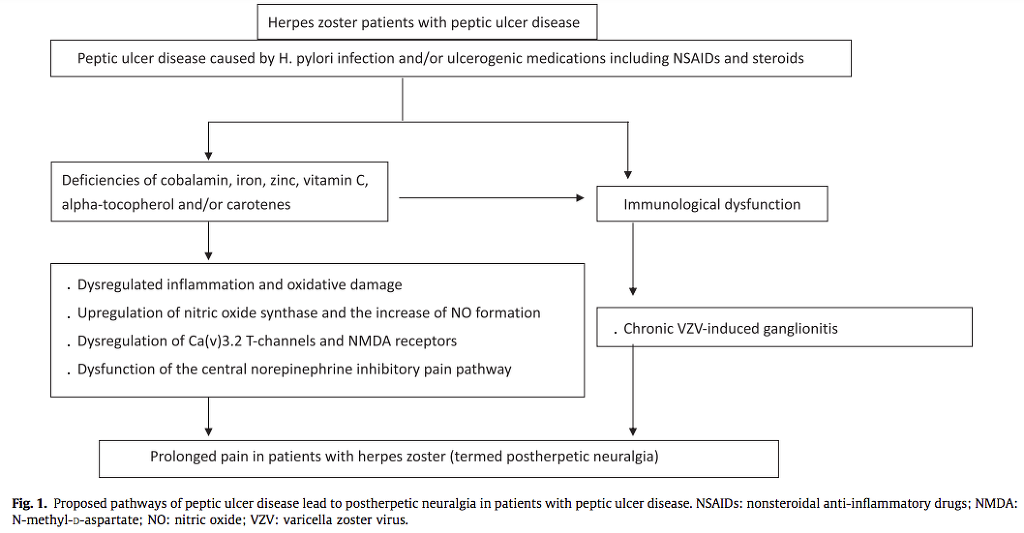 Furthermore, nutrient deficiencies including zinc, iron, cobalamin and vitamin C are associated with dysregulation of Ca(v)3.2 T-channels and N-methyl-D-aspartate receptors, upregulation of nitric oxide synthase, the increase of nitric oxide formation and dysfunction of central norepinephrine inhibitory pain pathway. Prospective cohort studies are suggested to test the hypothesis. We further propose that a follow-up study that contains two groups of herpes zoster patients, i.e., with or without gastroendoscopy-proven PUD, be conducted to determine their incidence of postherpetic neuralgia. In addition, despite of the high proportion of zoster patients having been treated with antiviral therapies, prevention and treatment of postherpetic neuralgia remain challenging in clinical practice. The potential risk of postherpetic neuralgia in zoster patients with PUD could mean that physicians need to pay more attention to the comorbidity--PUD in patients with herpes zoster and treat PUD earlier in order to prevent the development of postherpetic neuralgia.