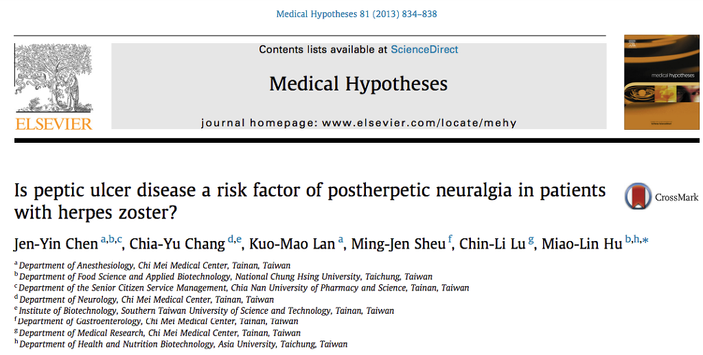 Based on our clinical observation which revealed that peptic ulcer disease (PUD) is one of the common comorbidities in patients with postherpetic neuralgia, we hypothesize that herpes zoster patients with PUD may be at a greater risk for the development of postherpetic neuralgia due to their impaired cellular immunity and depressed nutritional status.