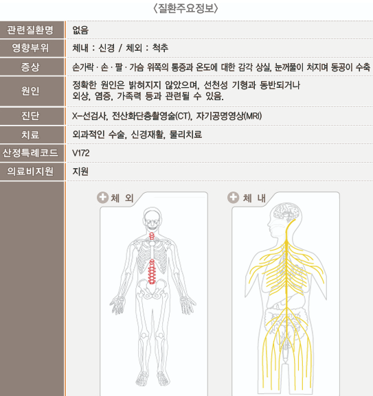 척수공동증(Syringomyelia)은 척수(Spinal cord) 안에 물이 찬 공동(Syrinx)이 생기는 병으로, 이 공동이 시간이 지나면서 점차 커지면서 척수신경을 압박하여 척수신경을 손상시키게 되므로 증상이 발생하게 됩니다. 척수에 공동이 생기는 원인은 다양하지만 특별한 원인을 알 수 없는 경우도 많습니다. 공동은 척수신경의 중심부에서 생기기 시작하여 바깥쪽으로 커지며 척수 전부를 채울 만큼 긴 공동을 만들기도 하는데, 공동이 늘어나게 되면서 다리, 팔, 등, 어깨를 조절하는 신경에 영향을 미칠 수 있습니다. 그러면 환자는 영향을 받은 부위의 아픔을 느끼게 되고 힘이 빠지거나, 뜨겁고 찬 것을 구분하지 못하게 될 수도 있습니다. 증상은 공동이 척추 어떤 곳에서 생기는지와 시간이 지나면서 얼마나 커지는지에 따라서 사람마다 다양하게 나타날 수 있습니다. 증상은 종종 대부분 천천히 발생하나, 일부 갑자기 발생하는 경우도 있으며, 증상을 수술 등의 방법으로 치료하지 않는다면 신경이 영구적으로 손상될 수 있고 만성적인 심한 통증으로 발전 할 수도 있습니다.
