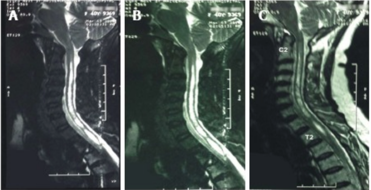 영상검사에서 척수 및 뇌간의 공동이 확인된 환자로 상기 공동을 유발할 수 있는 외상 및 손상의 병력이 없는 경우. 무증상 척수내수종(asymptomatic hydromyelia)은 제외. *진단방법: 영상검사, 진단검사 |