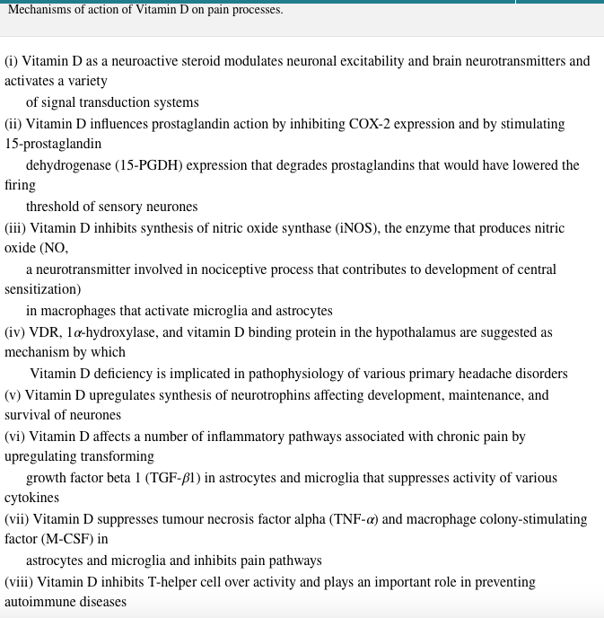 신경활성 스테로이드 물질로서 비타민 D는 신경흥분과 뇌 신경전달물질을 조절하고 신호활성 시스템을 활성화함으로써 만성통증을 치료함.