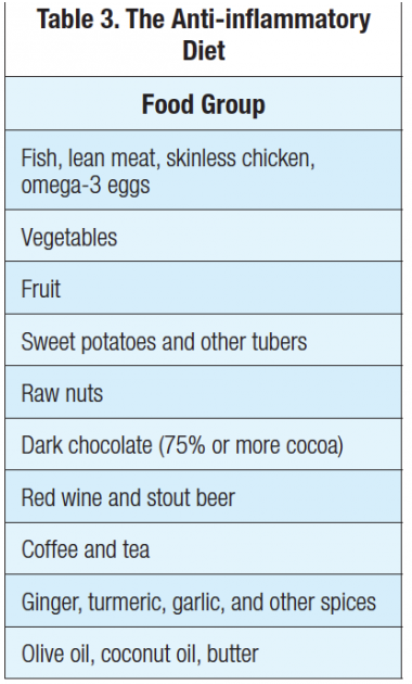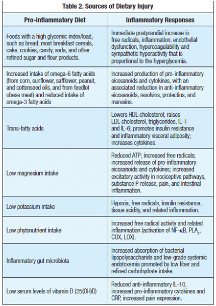 As described in this article, foods can acutely stimulate inflammation and lead to the development of a chronic pro-inflammatory state. Patients in pain already are inflamed and need to be educated about the importance of consuming the anti-inflammatory foods listed in Table 2.