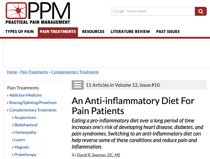 Taken together, these studies support the hypothesis that an anti-inflammatory diet should be applied in pain patients.13 This article will briefly review the chemistry of pain and inflammation and examine various components of the diet, which reduce the expression of pain/inflammation chemistry.