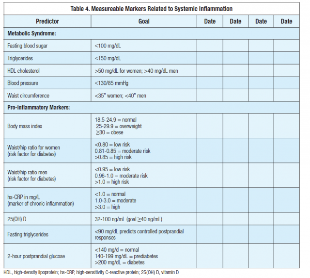 Keeping track of laboratory and physical findings also can be useful for patients and doctors. Table 4 includes markers for the pro-inflammatory metabolic syndrome and other markers that suggest the presence of a pro-inflammatory state. The goal should be to normalize the markers as patients go through the process of adhering to the anti-inflammatory diet and related anti-inflammatory lifestyle changes, which should include adequate sleep, exercise, and stress reduction.