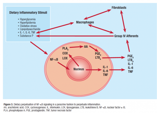 A metabolic mechanism of diet-driven pain and inflammation is best illustrated by NF-κB signaling. NF-κB is the most comprehensively researched cell-signaling molecule, and it has been directly linked to pain expression.90,91 In fact, efforts have been directed at developing pain medications that inhibit NF-κB.92 As illustrated in Figure 1, NF-κB is stimulated by group IV afferent-derived substance P. Figure 3 illustrates that NF-κB also is stimulated by various nutritional factors, such as the overconsumption of sugar and flour, and the related oxidative stress and free radical production.