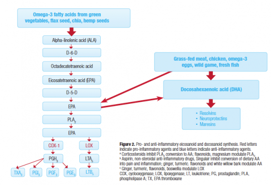 The reduction in n-3 fatty acid intake adds to the inflammatory/painful state because n-3s convert to mediators that resolve inflammation and reduce pain. These mediators are derived from EPA and DHA and are called resolvins, protectins, and maresins.39,40,44