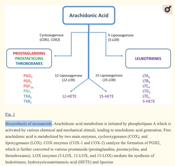 Inflammatory stimuli activate phospholipase A2 (PLA2), which clips the polyunsaturated fatty acid from the middle carbon in the cell membrane phospholipid and delivers it to the cytoplasm. The most commonly liberated fatty acid is n-6 arachidonic acid because we now eat n-6 fatty acids at unprecedented levels.11,37,38 Other liberated fatty acids include n-6 dihomo-γ-linolenic acid, omega-3 (n-3) eicosapentaenoic acid (EPA), or n-3 docosahexaenoic acid (DHA) (Figure 2). When in the cytoplasm, arachidonic acid is acted on by cyclooxygenase (COX-1 or COX-2) and lipoxygenase (LOX). COX enzymes convert arachidonic acid into pro-inflammatory eicosanoids including prostaglandin E2 (PGE2), prostaglandin F2α (PGF2α), and thromboxane A2) while LOX converts arachidonic acid into pro-inflammatory leukotriene B4 (LTB4).37-40