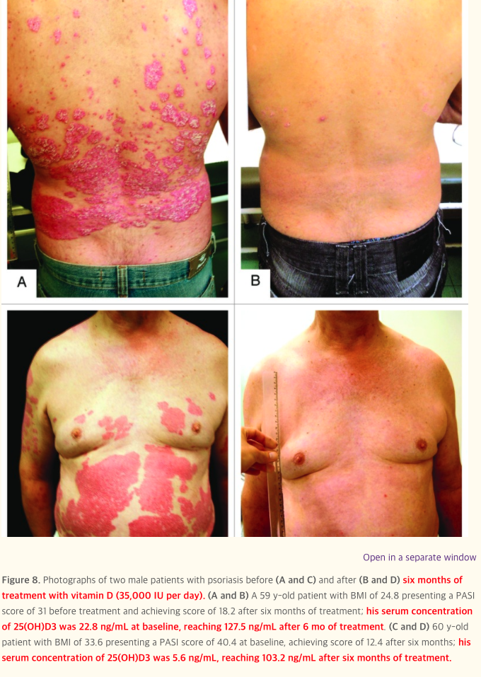 위 A 환자(59세)는 하루에 3만 5천 IU를 6개월동안 매일 복용하여 22ng/ml 수치를 127.5ng/ml까지 올려 건선치유효과를 본 경우