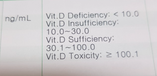 - 비타민 D 수치(혈액검사결과)가 20ng/ml(50nmol/L)이하일 경우에는 반드시 30ng/ml(75nmol/L)이상까지 치료해야 함.