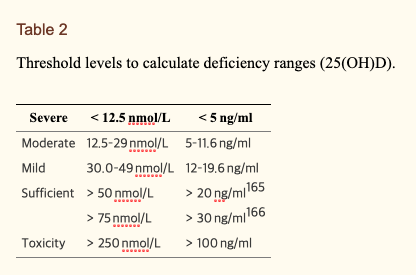 Threshold levels to calculate deficiency ranges (25(OH)D).