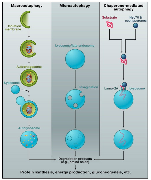 Macroautophagy: A portion of cytoplasm, including organelles, is enclosed by an isolation membrane (also called phagophore) to form an autophagosome. The outer membrane of the autophagosome fuses with the lysosome, and the internal material is degraded in the autolysosome. Microautophagy: Small pieces of the cytoplasm are directly engulfed by inward invagination of the lysosomal or late endosomal membrane. Chaperone-mediated autophagy: Substrate proteins containing a KFERQ-like pentapeptide sequence are first recognized by cytosolic Hsc70 and cochaperones. Then they are translocated into the lysosomal lumen after binding with lysosomal Lamp-2A. After all three types of autophagy, the resultant degradation products can be used for different purposes, such as new protein synthesis, energy production, and gluconeogenesis.