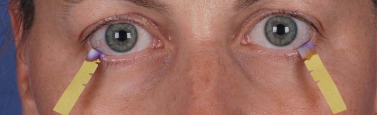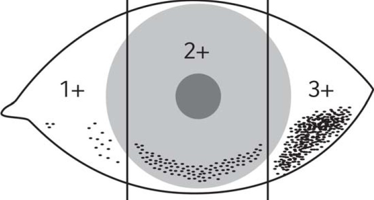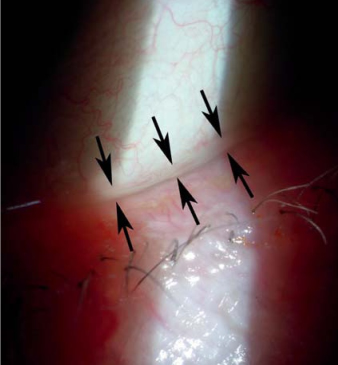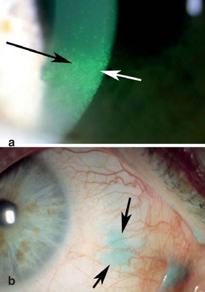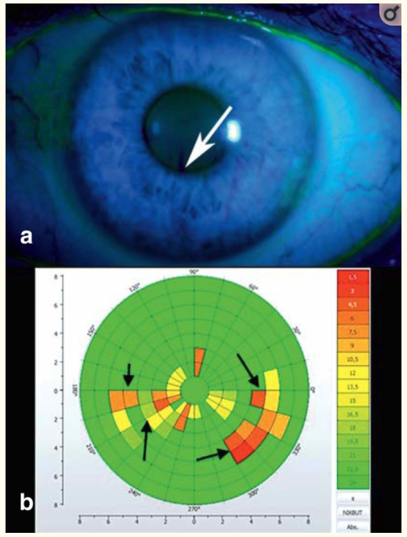 More or less pronounced conjunctival redness and damage to the ocular surface with punctate epithelial erosions (superficial punctate keratitis) are typical in dry eye; temporal conjunctival folds parallel to the lid margin are indicative. The lower tear meniscus is reduced. In addition, there are often signs of meibomian gland dysfunction with thickened eyelid margins and telangiectasia. The meibomian gland orifices are obstructed with a cloudy, granular or solid secretion that can only be expressed by exerting considerable pressure on the lower lid (15). If the meibomian gland dysfunction is associated with inflammation, blepharitis (inflammation of the lid margin) or meibomitis (inflammation of the meibomian glands) is present.
