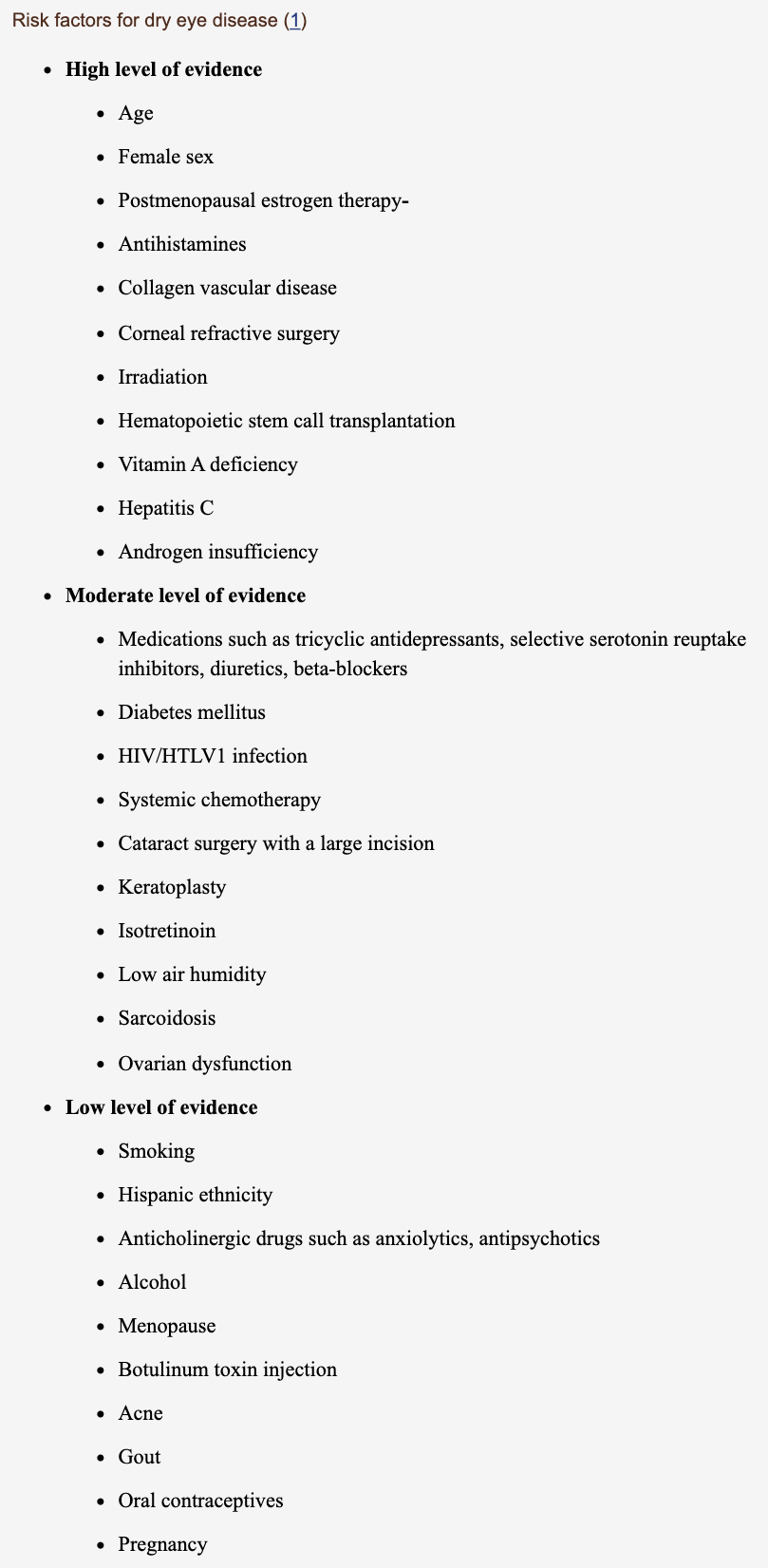 - 나이, 여성, 폐경후 호르몬치료, 항히스타민, collagen vascular disease, corneal refractive surgery, 방사선치료, 비타민 a부족, c형간염, 남성호르몬 부족