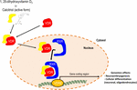 When entering a target cell, calcitriol dissociates from vitamin D-binding protein (the transporter of vitamin D in blood), diffuses across the plasma membrane, binds to the VDR, and the formed complex migrates to the nucleus. The activated VDR dimerizes with another nuclear receptor, the retinoic acid receptor (RXR). This RXR/VDR/calcitriol heterodimer binds to the vitamin D responsive element (VDRE), a specific sequence in the promoter region of target genes. Upon binding to the VDRE, the heterodimer activates or suppresses gene transcription. VDRs can also form homodimers but their functional significance is not known (VanAmerongen et al., 2004). In addition, efficient transcription requires co-activator or co-repressor proteins, such as Smad3, an effector of the TGF beta pathway (VanAmerongen et al., 2004). In the calcitriol pathway, Smad 3 acts as a coactivator and Smad 7 abrogates the Smad3-mediated VDR response. Cells of the central nervous system (microglia, neurons, and astrocytes) express VDR and can respond directly to calcitriol (Emmanuel et al., 2002).