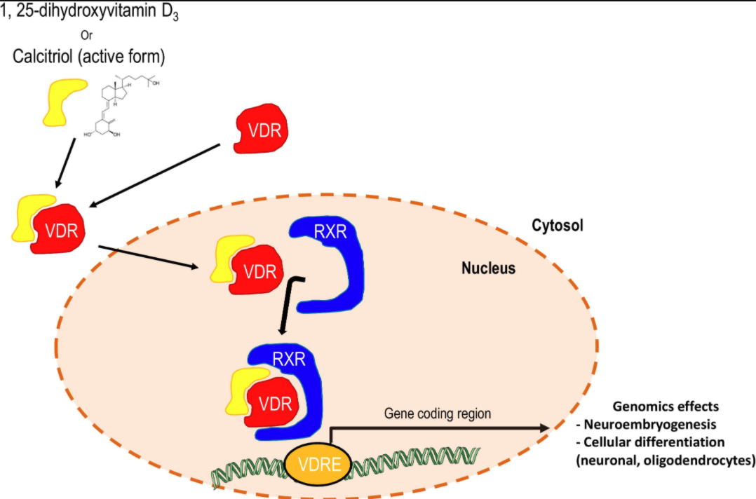 Vitamin D is converted into its hydroxylated derivative, 1,25-(OH)2-vitamin D3, by two successive hydroxylations, one in the liver and one in the kidneys. Its liposolubility allows calcitriol to pass through cell membranes without a transporter. Within the cell, the vitamin D receptor (VDR), a member of the nuclear-receptor superfamily, mediates the biological activity of 1,25-(OH)2-vitamin D3 by regulating gene expression, similarly to other steroid hormone receptors (Figure 2). Following a conformational change, the VDR regulates gene transcription by binding to hexameric core-binding motifs in the promoter regions of target genes (Issa et al., 1998). The vitamin D-VDR endocrine system has been identified in nearly all nucleated cells. Microscopic autoradiography of the VDR has identified the target organs for vitamin D, especially the brain and spinal cord, for which there is a high binding rate (Stumpf, 2012). Although not fully understood, VDR could be involved in the development of a variety of neurological illnesses.
