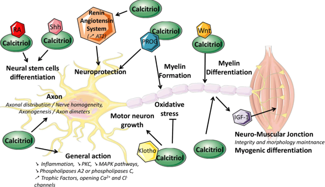 As mentioned, vitamin D3 and its metabolites also play a role in neurites integrity. The VDR KO mouse model described by Sakai et al. (2015) underlined the involvement of calcitriol and the VDR in axonal homogeneity, integrity, and maintenance of neuromuscular junctions. Indeed, the analysis of transversal sections of sciatic nerves from VDR-deficient mice showed heterogeneity of the axonal diameters and axonal repartitioning among the nerves (Sakai et al., 2015). In addition, they showed in a rat primary Schwann cells model, that calcitriol upregulates the expression of IGF-1, a myelin basic protein which is a myotrophic and neurotrophic factor. Gao et al. (1999) showed that IGF-I deficient mice exhibit reduced peripheral nerve conduction velocities and smaller axonal diameters. They also demonstrated that IGF-1 plays a key role in the growth and development of the peripheral nervous system and that systemic IGF-1 treatment can enhance nerve function in these adults deficient mice (Gao et al., 1999).