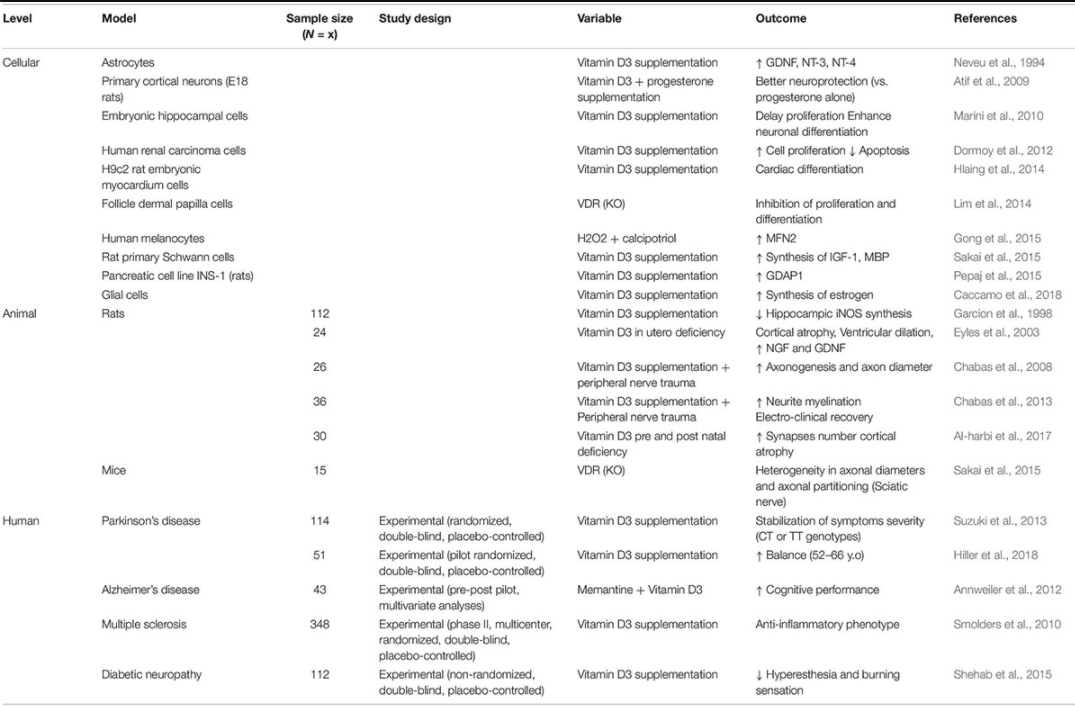 For instance, at cellular level, neuronal differentiation comparing standard to calcitriol-supplemented cell cultures, may help assess if calcitriol induces or speeds-up neuronal differentiation. This could be performed on cell lines such as SH-SY5Y or on induced pluripotent stem cells (iPSc). Several techniques such as qRT-PCR, Western-blot and immunostaining on PGP9.5, islet, tuj1, HB9 expression, which are markers of neuronal differentiation, could assess an additive or a synergistic effect of vitamin D3 and other fat-soluble vitamins. Moreover, as micro-glial cells can synthetize calcitriol, 3D-cell culture including neuronal and glial cells could be relevant to study micro-environmental regulation of calcitriol synthesis.