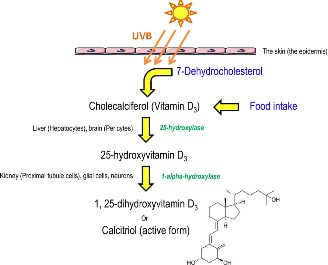 Figure 1. Schematic representation of calcitriol synthesis in humans. Cholecalciferol, from food intake or derived from 7-dehydrocholesterol after sun exposition, is converted to calcitriol, the active form, by two hydroxylations (Emmanuel et al., 2002; Eyles et al., 2005; El-Atifi et al., 2015).