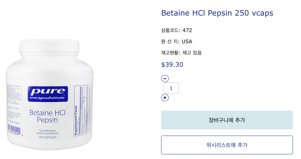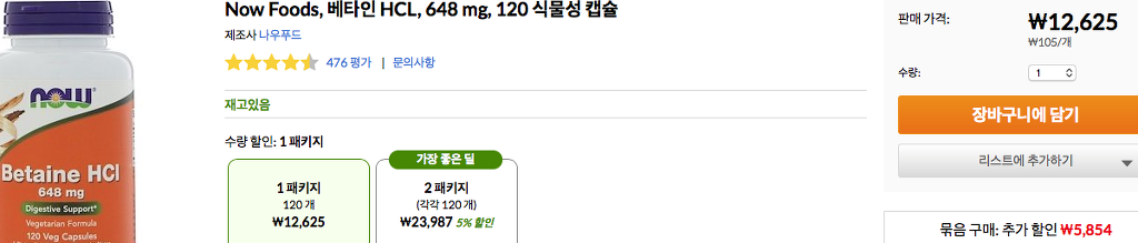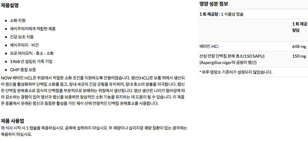 - Now의 648mg베타인 Hcl 1알이면 염산작용으로 효과가 있음.