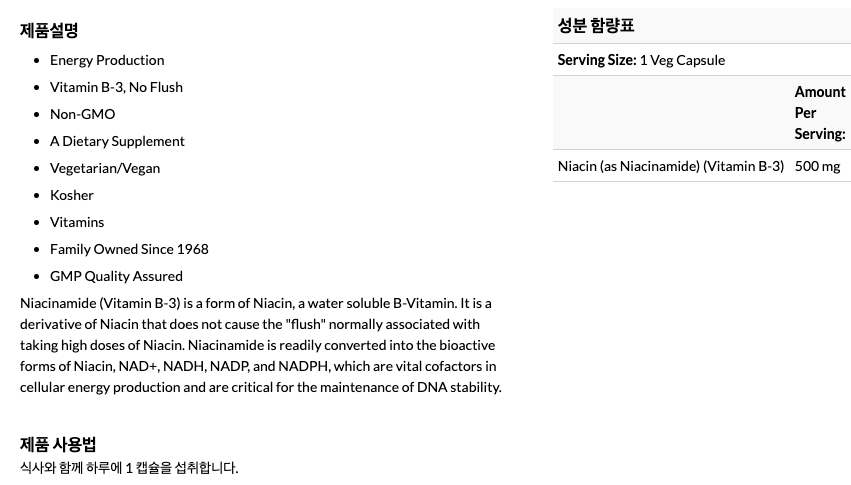 - 나이아신아마이드는 쉽게 나이아신, NAD+, NADH, NADP, NADPH의 생물학적 형태로 전환되어 세포에서 에너지를 생산하는데 중요한 보조인자(cofactor)로 작용하고 DNA stability의 유지에 중요한 역할을 함.