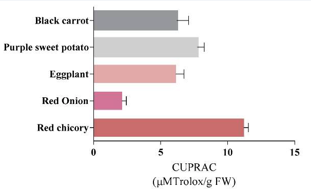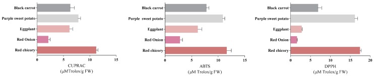 From the highest to the lowest, the order of the samples that were used in this study based on the antioxidant activity was red chicory > purple sweet potato > black carrot > eggplant > red onion. This order was constant for all three types of antioxidant assays used in this study, regardless of the assay used. Red chicory showed the highest activity in all three methods, where the values ranged between 11.2 ± 0.341–17.4 ± 0.346 µM/g FW. In the literature regarding the ABTS results, red chicory had a lower value than that determined in this study for red chicory (5.067 ± 35.6 µM/g FW) [26]. Red onion had the lowest antioxidant activity, where the values were between 1.6 ± 0.105 and 2.8 ± 0.469 µM/g FW. Following another study, the results that were obtained through ABTS and DPPH assay were higher and are in between 21.31 ± 0.41–22.90 ± 0.01 µM/g DW [6]. The other three samples exhibited antioxidant activity values that ranged between 7.8 ± 0.497–6.1 ± 0.604 µM/g FW for CUPRAC, 10.8 ± 0.420–7.7 ± 0.552 µM/g FW for ABTS, respectively, 16.1 ± 0.805–2.8 ± 0.140 µM/g FW for DPPH. The most significant difference between the literature and our antioxidant activity results was observed in purple sweet potato, presenting higher values than ours, such as: 7.25 ± 0.01 mM/100 g DW (ABTS) and 5.50 ± 0.01 mM/100 g DW (DPPH) and eggplant showing lower values than ours, such as 66.74 ± 4.60 µg/mL (DPPH) and 53.18 ± 0.71 µg/mL (ABTS) [16,27]. The explanation for those differences can be attributed to the extraction methods, solvents, and moreover the fact that the listed studies have used dried powdered samples.