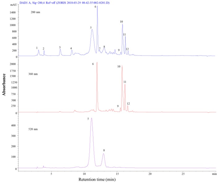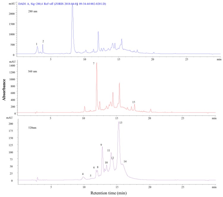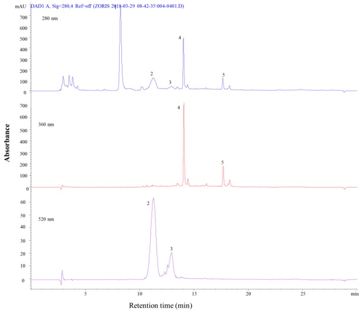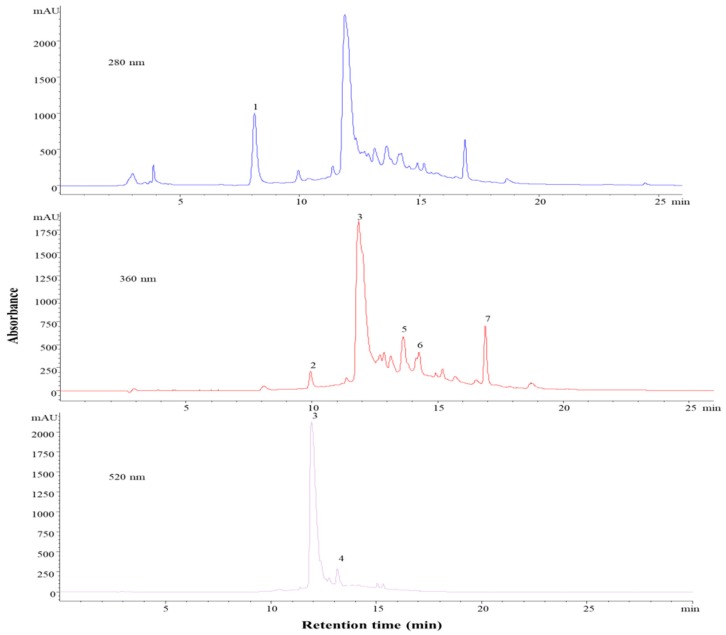 HPLC-PDA chromatograms of eggplant recorded at 280, 360 and 520 nm.