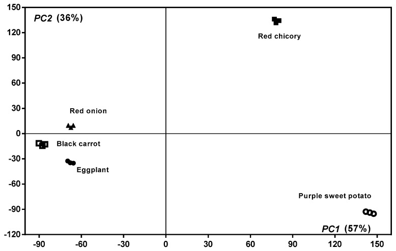 When considering all of the great benefits of phenolic compounds, screening the possible sources of the them and discovering their individual members that are present in each plant of interest is a popular research area. Exploring new sources of polyphenols or deeper investigation of them may create new opportunities that are associated with global nutrition and food requirements [14]. It is critical to know the qualitative and quantitative distribution of the phenolic compounds, such as phenolic acids, flavonoids, anthocyanins in medicinal plants, fruits or vegetables, and their other related characteristics, including their antioxidant properties. Accordingly, this study targeted an inclusive understanding of phenolic composition of five selected red-fleshed vegetables that are commonly consumed in Europe: eggplant (Solanum melongena), red chicory (Cichorium intybus), red onion (Allium cepa), purple sweet potato (Ipomoea batatas), and black carrot (Daucus carota cultivar Deep Purple). Determining the total phenolic and flavonoid content of these five vegetables, their antioxidant activities that are based on three common methods, mass spectroscopic identification, and quantification of the members of these phenolic compounds present in each vegetable, including anthocyanins and statistical correlation between antioxidant activities and the specific type of phenolic compounds, such as anthocyanins, flavonoids, anthocyanins, and phenolic acids were aimed at this study. Although some of this information could be readily available in the literature, a more comprehensive investigation was targeted at this attempt. Additionally, to the best of our knowledge, the assessment of the impact that was exhibited by the specific type of phenolic compounds on the antioxidant activity was examined for the first time with this effort.