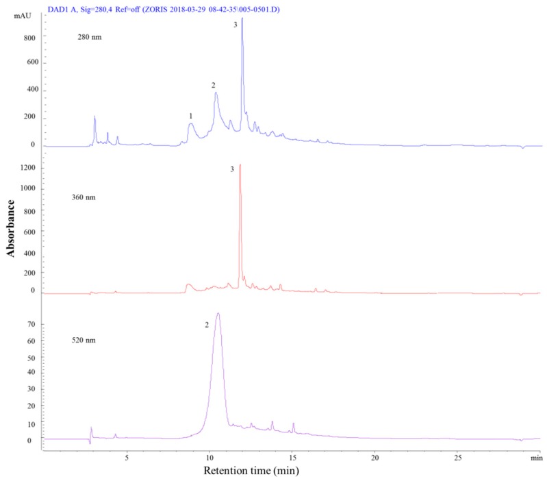 HPLC-PDA chromatograms of red onion recorded at 280, 360, and 520 nm.