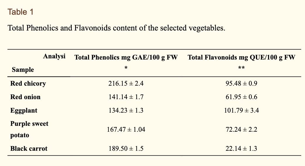Vegetables comprise a significant portion of our daily diet with their high content in nutrients including fiber, vitamins, minerals, as well as phenolic compounds. Vegetable consumption has been shown to be positively associated with the prevention of several degenerative diseases thanks to their bioactive compounds. Accordingly, five selected vegetables, namely, red chicory, red onion, eggplant, purple sweet potato, and black carrot were thoroughly assessed for their phenolic content in this study.