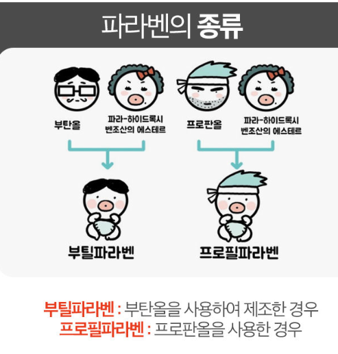 메틸 파라벤, 프로필 파라벤, 부틸 파라벤, 에틸 파라벤 등으로 끝나는 것은 모두 방부제임.