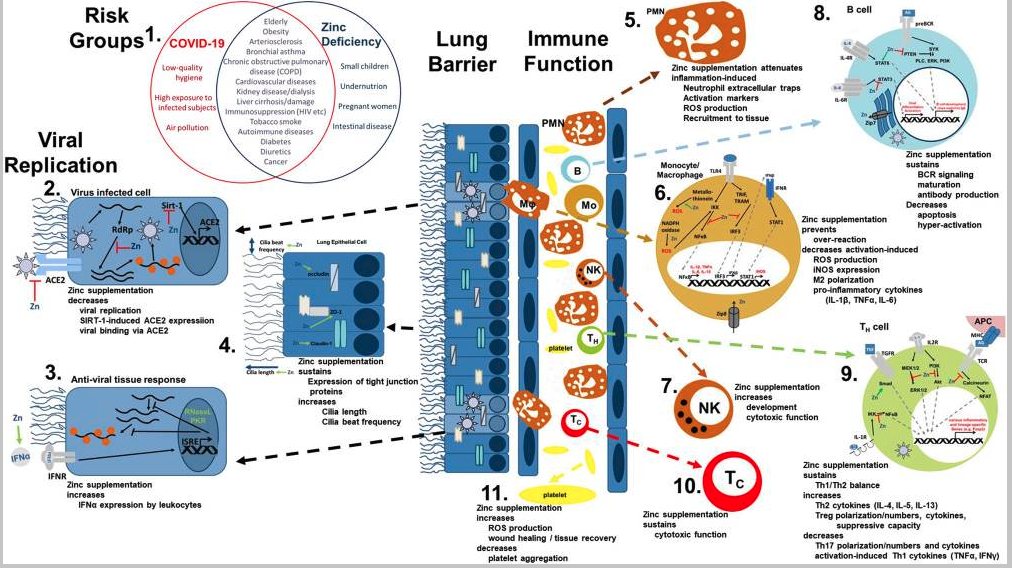 - 아연부족증은 코로나 19의 해로운 영향에 중요한 역할을 함.