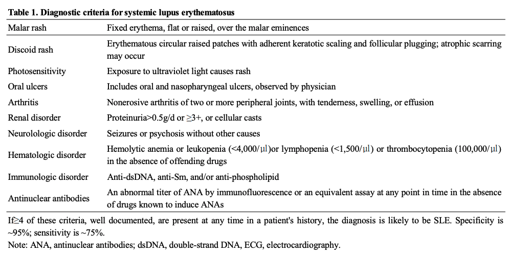 진단기준은 11개의 기준항목 중에서 4개 이상의 항목 이 확인되면, 환자가 루푸스를 가지고 있을 가능성이 높다 (특이도와 민감도는 각각 90%와 75%). 많은 환자들에서 시 간이 경과함에 따라 추가적으로 진단기준에 부합된다. 자가 항체는 발병초기부터 발견될 수 있다. 항핵항체(antinuclear antibody, ANA)는 선별검사로 가장 적합하다. 항핵항체는 질병 경과 중에서 95% 이상의 환자들에게서 양성이므로, 반복적으로 음성이 나오면 루푸스가 아닐 가능성을 시사한다. 항핵 항체는 일부 정상인에서도 낮은 역가로 나타날수 있으며 나이가 들수록 그 출현빈도는 증가한다. 이중나선(double stranded) DNA에 대한 고역가의 IgG 항체와 Sm 항원에 대한 항체는 모두 루푸스에 특이적이다. 따라서 합당한 임상증상이 있을 경우, 진단에 도움이 된다. 루푸스에 부합되는 임상증상없이 다양한 자가항체만 양성인 경우 루푸스로 진단해서는 안된 다. 4개 이상의 진단항목을 충족시키지 못하지만 루푸스가 의심될 경우 lupus-like syndrome이라고 부르기도 한다.