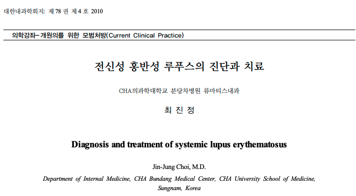 전신성 홍반성 루푸스(systemic lupus erythematosus, SLE)는 특정 핵항원에 대한 자가항체 생성을 특징으로 하는 자가면역 질환이다. 이런 자가항체들은 면역복합체를 형성시키고 조직에 침착되어 염증과 조직손상을 유발시키게 된다. 임상양상은 매우 다양하며, 젊은 가임기 여성에서 가장 많지만 성별과 나이, 인종의 구분없이 발생할 수 있다. 원인은 정확히 알려져 있지 않으나 감수성 유전자와 환경적 요인들의 상호작용에 의해서 비정상적인 면역반응이 유발됨으로써 발생한다. 이러한 면역반응에는 T 및 B 림프구의 과도한 반응성과 부적절한 조절로 인해서 비정상적인 면역반응을 보인다. 루푸스의 치료는 지난 한 세기 동안 생존률과 삶의 질에서 비약적인 발전을 가져왔다. 이런 발전은 비약물적 치료와 약물치료가 포함된다. 루푸스 치료의 전환점은 1950년대에 코르티코스테로이드의 발견과 사용이며, 1960년대와 1970년대에 신투석과 싸이클로포스파마이드에 있다. 비약적 발전의 핵심은 루푸스가 여러 증상과 징후가 모인 스펙트럼과 같은 질환(a spectrum of disease)이라는 것이며, 따라서 각기 환자 의 개별적인 소견에 근거해서 치료해야 한다.