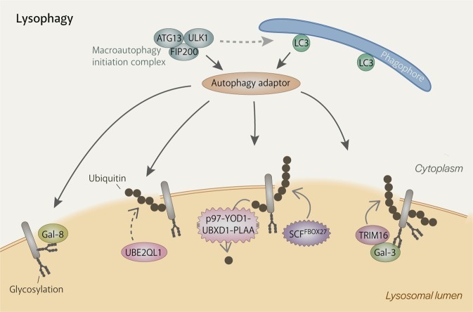 Mechanisms of autophagy machinery recruitment to damaged lysosomes.