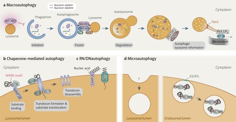 Autophagy refers to a set of pathways by which cytoplasmic material is delivered into the lysosome for degradation (Fig. (Fig.1).1). Starvation and other threats to cellular homeostasis strongly induce autophagy to acquire nutrients by recycling non-essential material or to eliminate harmful material. It comes mainly in three forms: macroautophagy, chaperone-mediated autophagy (CMA), and microautophagy1. Central to all of them is the lysosome, the characteristically acidic organelle with over 60 luminal hydrolases and important cellular regulators2.