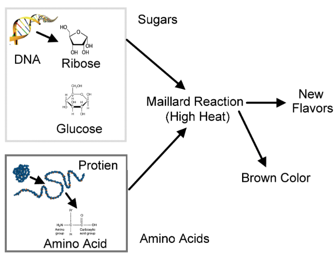 마이야르 반응은 스테이크를 구울 때 나는 맛있는 냄새와도 직접적인 연관성을 가지고 있다. 스테이크와 같은 육류의 맛은 거의 대부분이 마이야르 반응을 통해 결정되며, 이는 미각과 후각이 깊은 연관이 있기 때문이다[