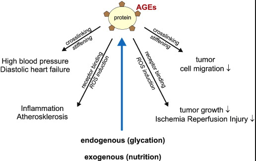 Non-enzymatic formation of advanced glycation endproducts (AGEs) is associated with degenerative diseases. Chronic accumulation of AGEs with age in tissues especially in the extracellular matrix is well known and at least in part responsible for e.g., collagen crosslinking, tissue stiffening and thus induction of high blood pressure or diastolic heart failure. Binding of soluble AGEs to the receptor for AGEs, RAGE, induces an inflammatory response whereas the soluble form of RAGE (sRAGE) can inhibit inflammatory tissue injury like arteriosclerosis in mouse models. However, there are a number of indications that AGEs have protective effects as well. AGEs may inhibit lung tumor growth, glyoxal induced AGE modification of human heart muscle can reduce an ischemia reperfusion injury and AGEs from nutrition can reduce ROS induced cell damage.