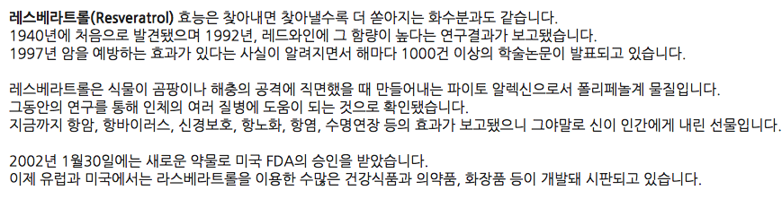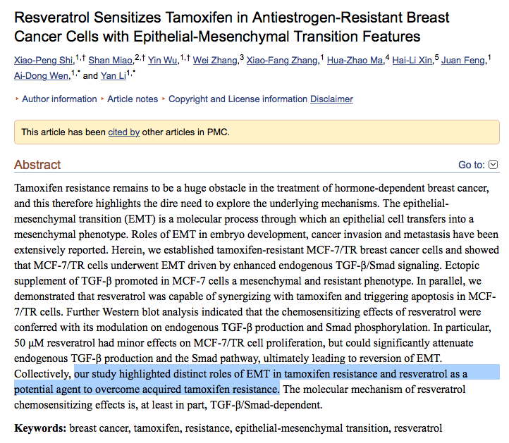 붉은 포도껍질과 적포도주에 많이 함유된 레스베라트롤(Resveratrol)은 강력한 항산화제 작용을 하면서 심장을 보호하고 혈관을 확장시켜 혈액순환을 도움. 또 DNA손상과 혈관손상을 방지해 장수하게 하는 성분으로 동물실험 결과 노화를 66%나 지연시키는 것으로 나타남. 또한 여성호르몬 과다로 인한 자궁근종, 자궁내막증, 자궁암, 유방암, 난소암, 자궁경부암, 전립선 비대증과 같은 암을 억제하는 효능도 있음. 특히 유방암 치료제로 사용하는 타목시펜과의 비교실험에서 타목시펜과 레스베라트롤이 같은 효과를 지니는 것으로 밝혀지기도 함.