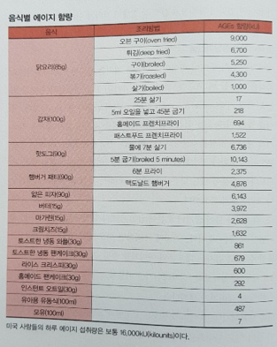 에이지를 줄이려면 수분이 없는 높은 온도보다 수분이 있는 낮은 온도에서 조리하는 것이 좋은데 조리시간보다는 조리온도가 중요함.