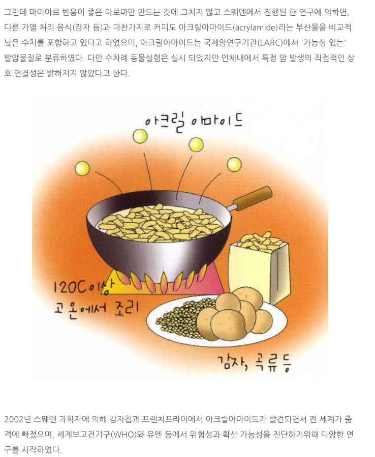 프렌치 프라이나 빵, 토스트, 쿠기, 고기, 군만두 등이 갈색으로 노릇노릇하게 구워지면서 당화되는 초기단계를 마이야르 반응이라고 하는데 120도 이상 고온에서 마이야르 반응이 진행되면 아크릴 아마이드라는 발암물질이 생김.