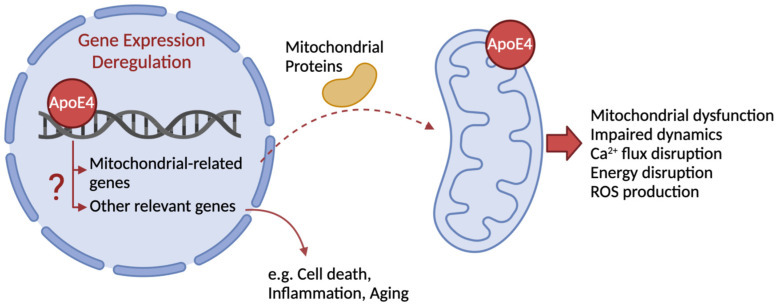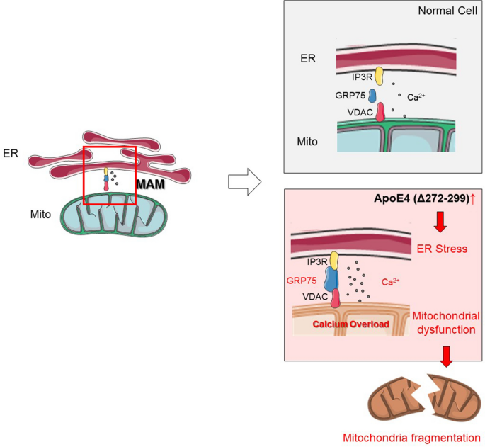 APOE4는 알츠하이머병 발병에 연관된 유전자입니다. APOE4는 미토콘드리아를 손상시키고, 미토콘드리아 기능을 저하시키는 것으로 알려져 있습니다. APOE4는 미토콘드리아의 산화 스트레스를 증가시키고, 미토콘드리아의 DNA 손상을 증가시키는 것으로 알려져 있습니다. APOE4는 또한 미토콘드리아의 에너지 생산을 감소시키는 것으로 알려져 있습니다. APOE4는 미토콘드리아를 손상시켜 알츠하이머병의 발병에 기여하는 것으로 생각됩니다.