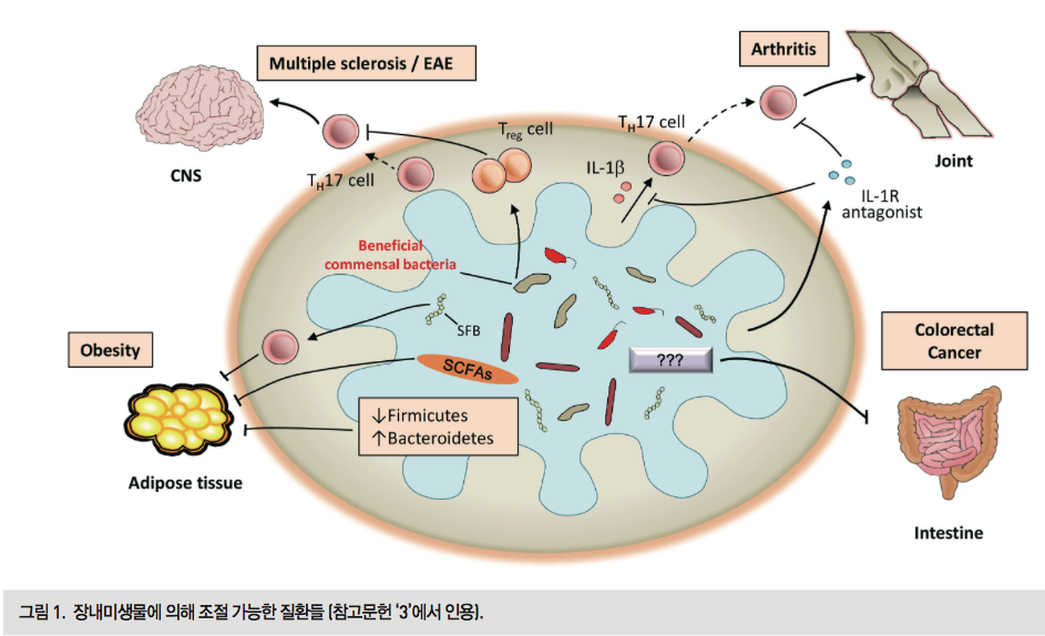 자가면역질환의 유발에도 장내 공생세균이 조절자 역할을 하는 것으로 잘 알려져있다. 장내공생세균인 SFB (segemented filamentous bacteria)는 소장에서 Th17 cell 분화에 관여하여 자가면역질환 발생에 영향을 주는 것으로 알려져 있다 [35]. 대표적인 자가 면역 질환인 류마티 스 관절염 유발 마우스를 무균화 하게 되면 염증성 Th17세포가 줄어들어 발병률이 저하하고, 이 무균 마우스에 SFB 를 단독으로 정착시키게 되면 다시 관절염 증상이 재발함이 보고 되었다 [45]. 최근 관절염 환자에서 Prevotellaceae 가 과다증식되어 있다는 보고가 있는데 이 균이 어떤기전으로 면역 과잉반응을 유도하는지는 아직 밝혀져있지 않다 [46].