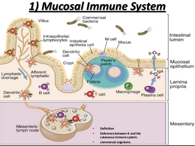 점막 조직에만 존재하는 M 세포는 외부항원을 uptake하는 역할을 하며 점막조직에 유도되는 항체 분비세포(plasma cells)는 주로 IgA를 분비하도록 프로그래밍되어 있으며 분비형 IgA 항체 (SIgA; secretory IgA antibody)는 상피세포를 통하여 장내강(gut lumen)으로 분비된다. Goblet cells에서 분비되는 뮤신(Mucus glycoprotein)은 장의 mucus layer 를 구성하는 주요소이고, paneth cells에서는 defencin으로 대표되는 anti-microbial peptide를 분비하여 외부에서 침입한 병원성 미생물을 중화시켜 숙주를 방어하는 역할을 담당하고 있다.